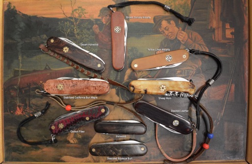 These are Victorinox Swiss Army knives that I have re-handled, using numerous materials for the handles. Several of these I planed down to the rivets to result in very thin handles, and thus a very thin knife for comfort in dress pants. I also added my own custom mosaic pins to many of them. Finally, the addition of a leather FOB, so they can be accessed rapidly and they are ready go.